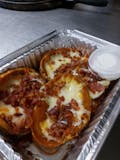 Cheese sauce base, Potato skins, bacon & cheese topped with scallions.