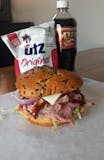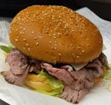 A generous portion of our in house made roast beef served on a grilled seeded bun with Mayo, lettuce, tomato and onion and American cheese.